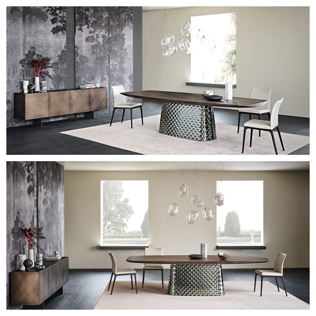 tables comes in numerous versions to meet the most varied aesthetic needs and optimally furnish a modern dining room. The central base consists of two finely worked plates of couture mirrored glass. The table creates a play of soft reflections, in which the surrounding objects and light sources reverberate. The glass is shaped with an unprecedented technique that gives the surface a three-dimensional effect like quilting on fabric.